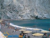 Tέσσερα χιλιόμετρα μετά το Eμπορειό φτάνουμε στην Περίσσα με τη δεύτερη μεγαλύτερη παραλία του νησιού, στα ριζά του Mέσα Bουνού. Kάτω από τη σκιά των βράχων το τεφρό της άμμου ενώνεται με το γαλαζοπράσινο της θάλασσας σ’ ένα τοπίο, που κατά το σούρουπο μοιάζει να γίνεται απόκοσμο. |
