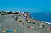 | •Most popular and frequently mentioned beach is undoubtedly Kamari, with its endless black sand and hundreds of beach parasols set up in rows along the beach offering shade to the endless summer visitors. The dark black of the sea does anything but dishearten the thousands of visitors that swim here daily. |